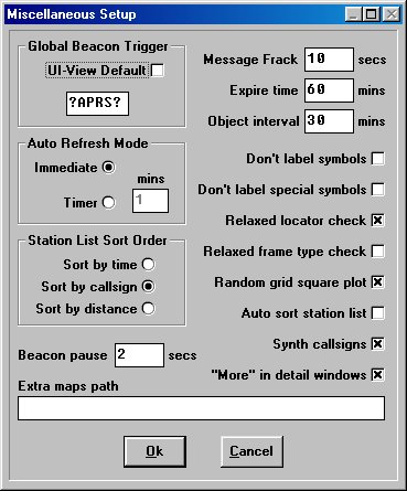 - Beacon interval : C'est ici que l'on paramètre l'intervalle d'émission des balises APRS, pour chaque type de station, il convient de mettre un intervalle en minutes qui est raisonnable, Fixed est l'intervalle d'émission pour une station fixe, 15 minutes semble être un paramétrage correcte, Mobile quand à lui est destiné aux stations mobile UI-View, la première case permet d'indiquer l'intervalle d'émission, la seconde précise la distance parcouru en miles ou kilomètres nécessaire pour qu'UI-View puisse passer en émission avant l'intervalle, le paramétrage Internet est identique à Fixed, sauf que celui-ci alimente l'APRServe.