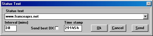 - Status text : Dans ce menu, pour une station fixe vous pouvez indiquer un peu n'importe quoi, cela peu aller de l'URL d'un site à votre e-mail personnel, vous pouvez aussi bien donné un complément d'information sur la balise beacon comment, comme le matériel utilisé. Pour une station mobile, ce champ est parfait pour indiquer votre situation, par exemple votre destination (QRD Lyon, retour QRA), votre secteur d'activité (Taxi, Livraison), le type de véhicule (Semi-remorque Rouge, Marque X bleu).