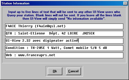 Menu accessible uniquement aux utilisateurs d'UI-View par la commande QUERY, vous pouvez mettre 5 lignes de texte pour décrire votre station, c'est l'équivalent de la commande info en packet.