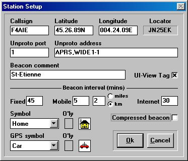 - Beacon interval : C'est ici que l'on paramètre l'intervalle d'émission des balises APRS, pour chaque type de station, il convient de mettre un intervalle en minutes qui est raisonnable, Fixed est l'intervalle d'émission pour une station fixe, 15 minutes semble être un paramétrage correcte, Mobile quand à lui est destiné aux stations mobile UI-View, la première case permet d'indiquer l'intervalle d'émission, la seconde précise la distance parcouru en miles ou kilomètres nécessaire pour qu'UI-View puisse passer en émission avant l'intervalle, le paramétrage Internet est identique à Fixed, sauf que celui-ci alimente l'APRServe.