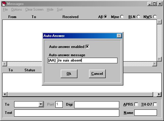 Si vous laissez fonctionner votre station pendant la journée, vous pouvez activer le mode de réponse automatique. Cela aura pour effet d'envoyer un message pré-établie à toutes les stations qui vous écriront pendant votre absence.